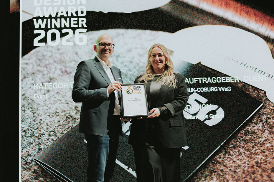 Ein historischer VW-Käfer, Big-Band-Sound, eine Dampflok, ein Gast aus den 1950ern: Was klingt wie die Premiere eines Theaterabends, war in Wahrheit ein Firmenjubiläum: „75 Jahre HUK in COBURG“. Für die ungewöhnliche und bis ins letzte gestalterische Detail durchgeplante Inszenierung aus dem Sommer 2025 wurde die Rödentaler Agentur Markatus GmbH mit dem German Design Award 2026 ausgezeichnet – als „Winner“ in der Kategorie „Excellent Communications Design – Event“.