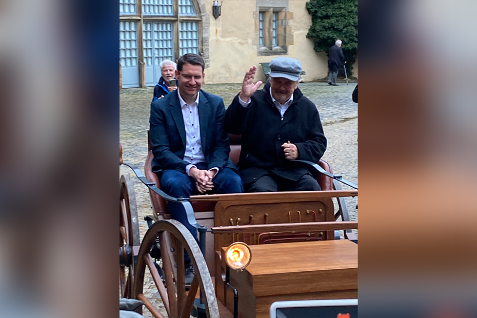 Zunächst zur IAA mobility in München (siehe COBURGER# 71), nun – mit feierlichem Schwung – in seine Heimatstadt Coburg, wo er im Innenhof der Veste seine ersten öffentlichen Runden drehte. Und wer dabei war, spürte: Hier fährt mehr als ein Vehikel. Hier fährt ein Stück Coburger Identität. Sein Erfinder, der Unternehmer Andreas Flocken, verband damals Kutschenbau mit der avantgardistischen Elektrotechnik seiner Zeit – ein visionärer Schritt, geboren aus dem Erfindergeist eines Industriestandorts, der schon früh mehr war als eine Residenzstadt. Doch der Elektrowagen selbst verschwand, wie so viele technische Pioniere, in den Windungen der Geschichte. Was blieb, war die Idee. Und die wurde nun unter der Federführung des Vereins Making- Culture e.V. mit wissenschaftlicher Präzision und handwerklicher Kunstfertigkeit neu zum Leben erweckt, der COBURGER hat ausführlich darüber berichtet. „Das ist ein wahnsinnig tolles Projekt, das Industriegeschichte tatsächlich greifbar macht für uns in der Region“, sagte Oberbürgermeister Dominik Sauerteig. Auch Prof. Dr. Günter Dippold, Bezirksheimatpfleger, erinnerte daran, dass Coburgs industrielle Vergangenheit nicht nur eine Fußnote sei: „Das kann man alles theoretisch erzählen, aber es ist immer was anderes, wenn dieser Erfindergeist einmal sichtbar, fassbar, greifbar wird.“ Genau das ist dem Team gelungen: den Geist von 1888 in das Heute zu übersetzen, ohne ihn zu verfälschen. Besonders bewegend waren die Worte der Urenkelin von Andreas Flocken, Ulrike Roth, die sich in das rumpelnde Gefährt setzte und den historischen Ritt wagte: „Die Federung ist natürlich kaum gegeben mit diesen Holzreifen, das ist natürlich schon schwierig“, sagte sie lachend. Doch dann wurde ihre Stimme leiser, stolzer: „Es war spannend, mal so einen Einblick in die ersten Tage des Automobils zu nehmen. Ja, da bin ich schon stolz.“ Hier geht’s zu unserem TV-Bericht: