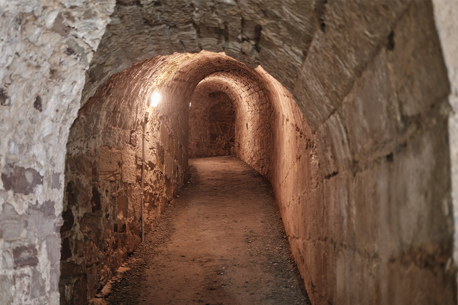 Die Jahrhunderte scheinen noch in der Luft zu hängen, als wäre hier unten trotz ständigem Luftstroms niemals gelüftet worden. Jeder Schritt ist ein Schritt im Damals, die Gänge sind original-behauen aus einer Zeit, in der alles nur von Hand ging – bis auf einen Teil der fingerförmigen Gänge. Gegenüber des neuen barrierefreien Eingangs im Norden der Festung sind die Falkenlöcher zu sehen – runde Öffnungen im Mauerwerk der Bastion St. Lothar.