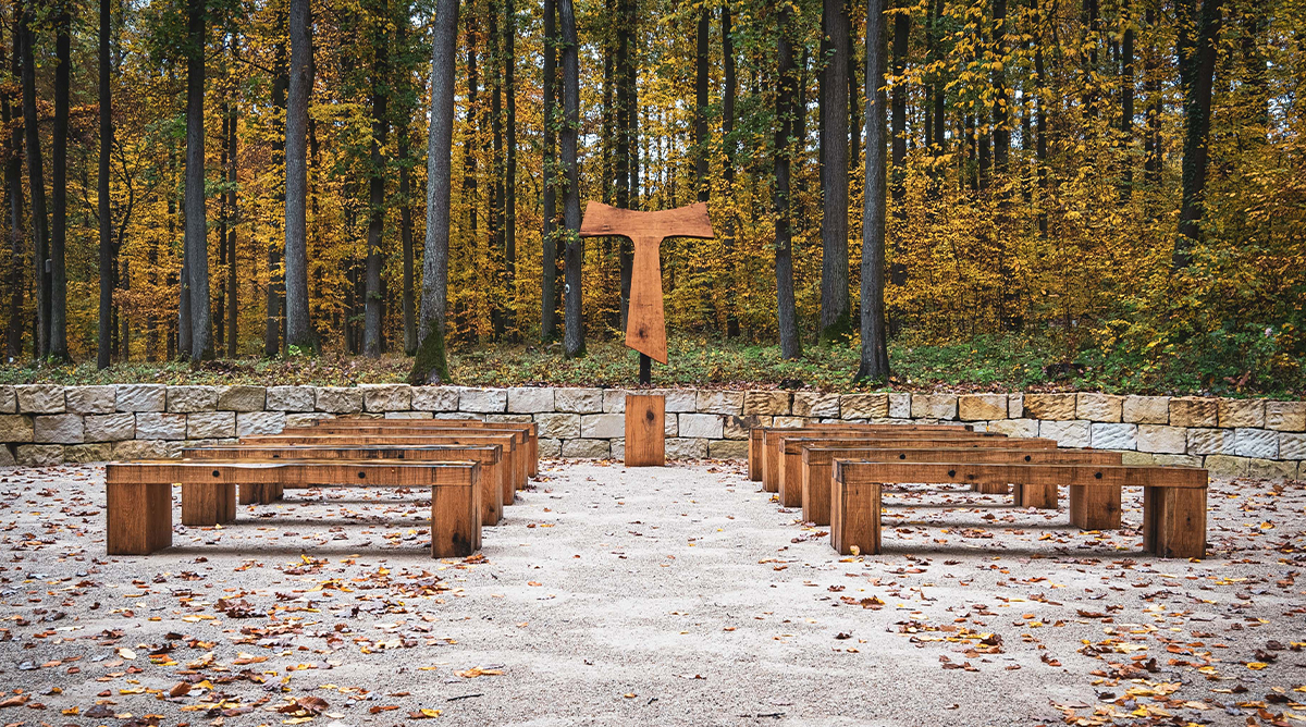 Die Beerdigungen finden meist auf dem Gedenkplatz statt. Hier stehen Bänke aus Eichen, die früher selbst im Wald standen. Vorne ist ein Taukreuz zu sehen. „Es ist aus einer alten, starken Eiche geschaffen, die in der Nähe von Kloster Banz einem Sommergewitter zum Opfer fiel. Jetzt hat sie eine neue Verwendung auf dem Naturfriedhof gefunden und lebt weiter, indem sie Trost spendet“, sagt Huth. Hier können alle um ihre Verstorbenen trauern. Die Zeremonie wird entweder von einem Pfarrer oder einen Pfarrerin gehalten oder auch von einem Trauerredner oder schlicht im Kreis der Familie.