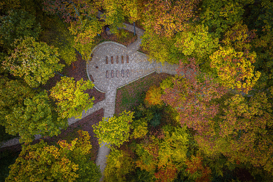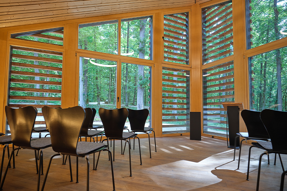 Zwischen den Grabbäumen gibt es immer wieder Waldbereiche, in denen von unten frisches Grün nachwächst – und die wie ein Vorhang die unterschiedlichen Bereiche abgrenzen. Überall stehen Bänke, auf denen die Trauernden sich mit einer Thermoskanne Kaff e und einem Stück Kuchen zu ihren Liebsten setzen. Für den Trauercafé nach der Beisetzung bietet Huth seinen neuen Gedenksaal an, innen aus Fichte, außen aus Lärche, im Grundriss der Form einer Bischofsmütze nachempfunden. Ein kleiner Ofen spendet Wärme, große Fenster holen den Wald nach innen. „Die Leute mögen es schlicht – sie haben sich ja auch bewusst für den Wald entschieden“, sagt Huth.