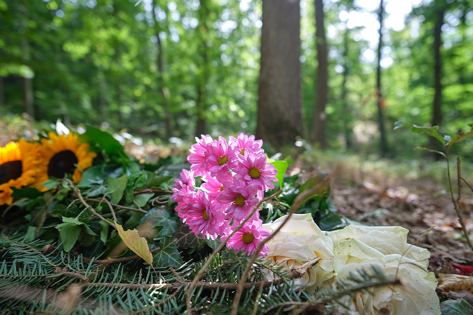 Die Beerdigungen finden meist auf dem Gedenkplatz statt. Hier stehen Bänke aus Eichen, die früher selbst im Wald standen. Vorne ist ein Taukreuz zu sehen. „Es ist aus einer alten, starken Eiche geschaffen, die in der Nähe von Kloster Banz einem Sommergewitter zum Opfer fiel. Jetzt hat sie eine neue Verwendung auf dem Naturfriedhof gefunden und lebt weiter, indem sie Trost spendet“, sagt Huth. Hier können alle um ihre Verstorbenen trauern. Die Zeremonie wird entweder von einem Pfarrer oder einen Pfarrerin gehalten oder auch von einem Trauerredner oder schlicht im Kreis der Familie.
