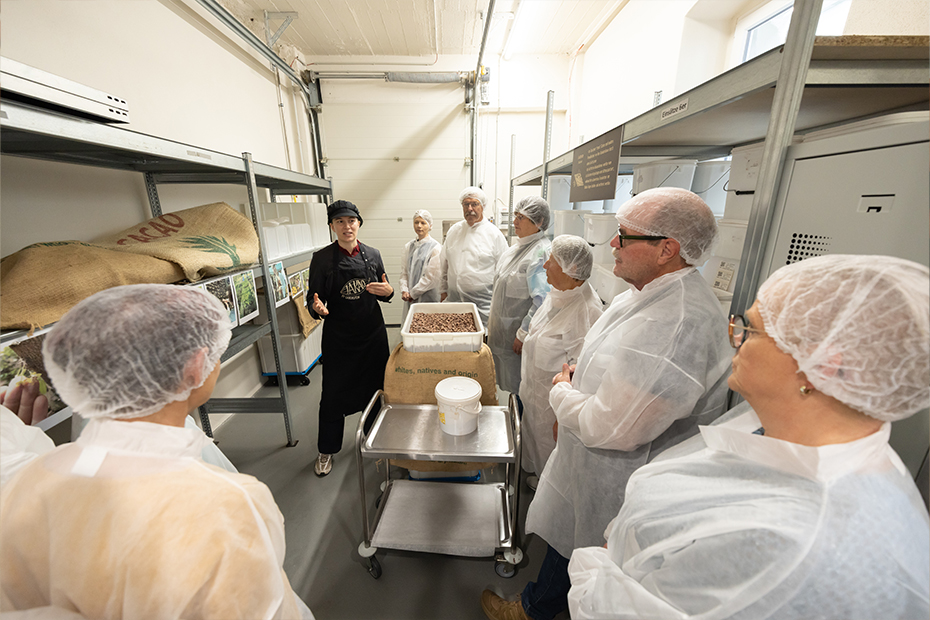 Und dafür gibt es auch eine neue Gläserne Manufaktur, Schaufenster für Gäste und Labor zugleich. Besucher können verfolgen, wie Bohnen verlesen, geröstet, conchiert und schließlich in glänzende Tafeln gegossen werden. „Es ist unfassbar viel Handarbeit – jede Bohne wird von Hand kontrolliert. Aber das Ergebnis ist eine Schokolade, die man sehen, riechen und schmecken kann“, schwärmt Kaub.